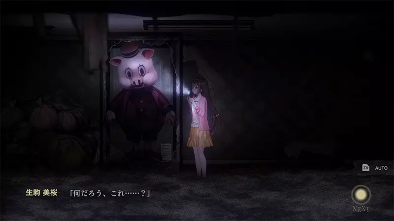地面滿是瓦礫,很多地方根本不能通行。墻角還立著一個詭異的豬頭人偶皮套,兩眼流出紅褐色的液體,仿佛血淚…